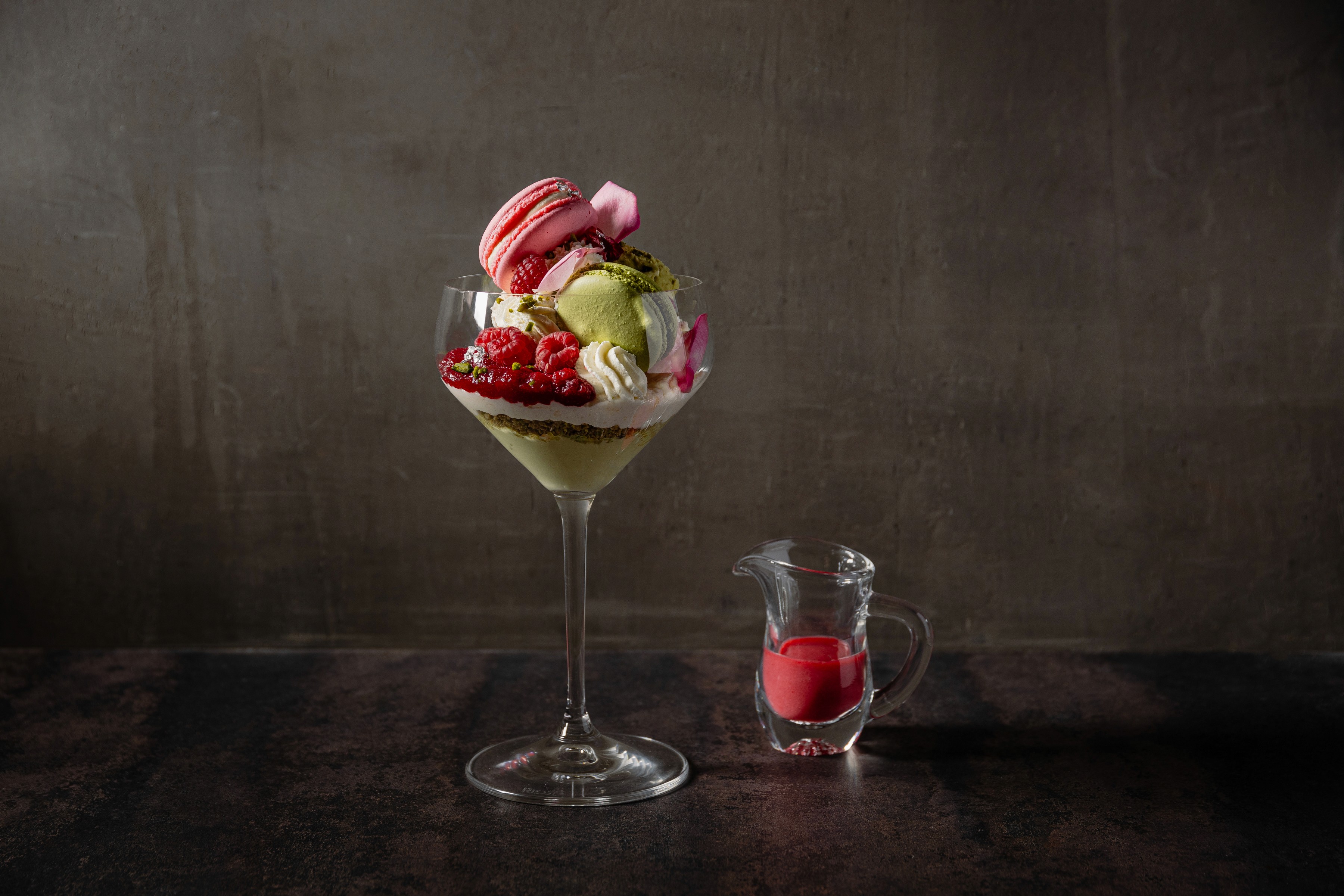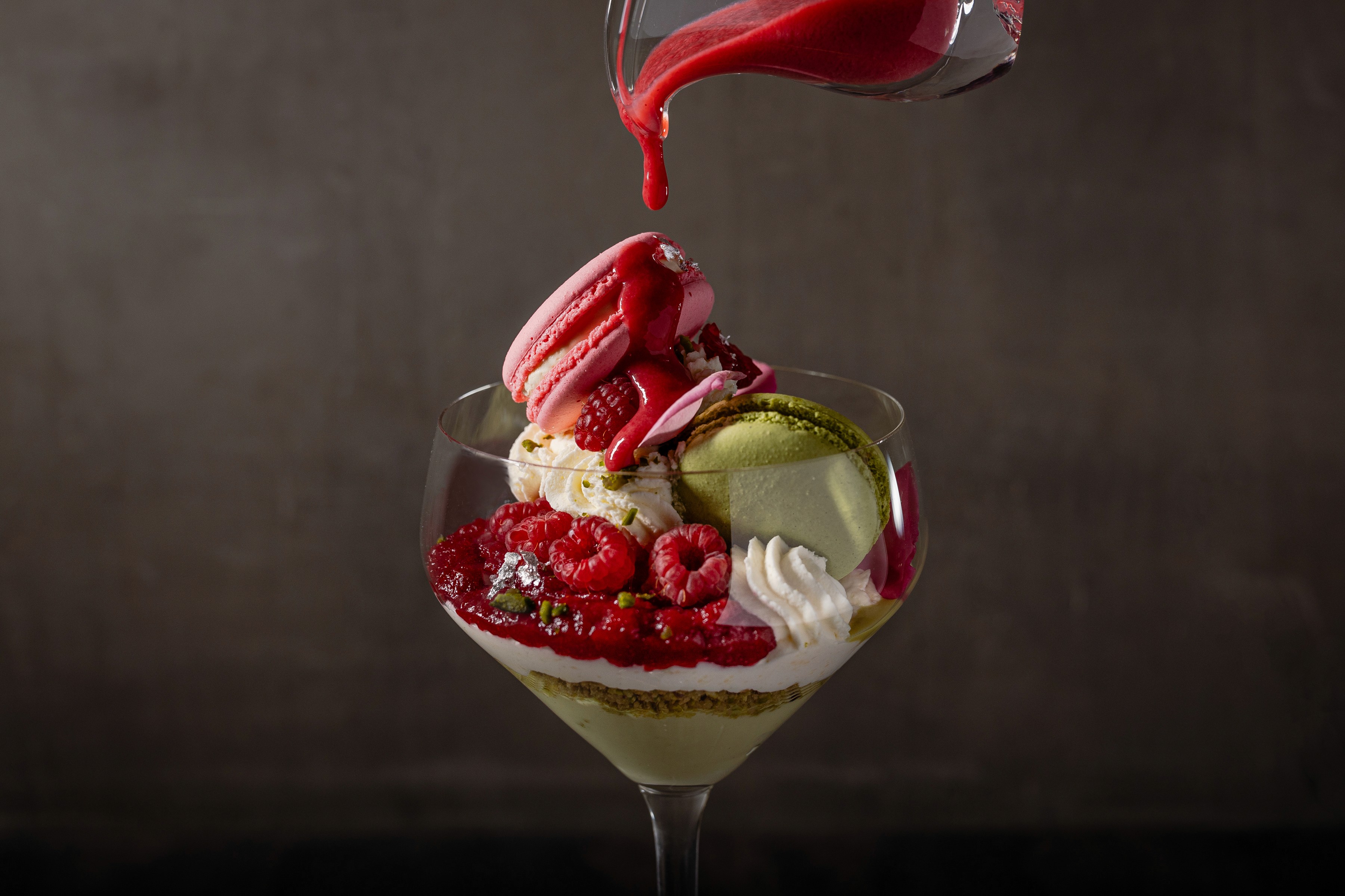 Parfait macaron pistache et framboise